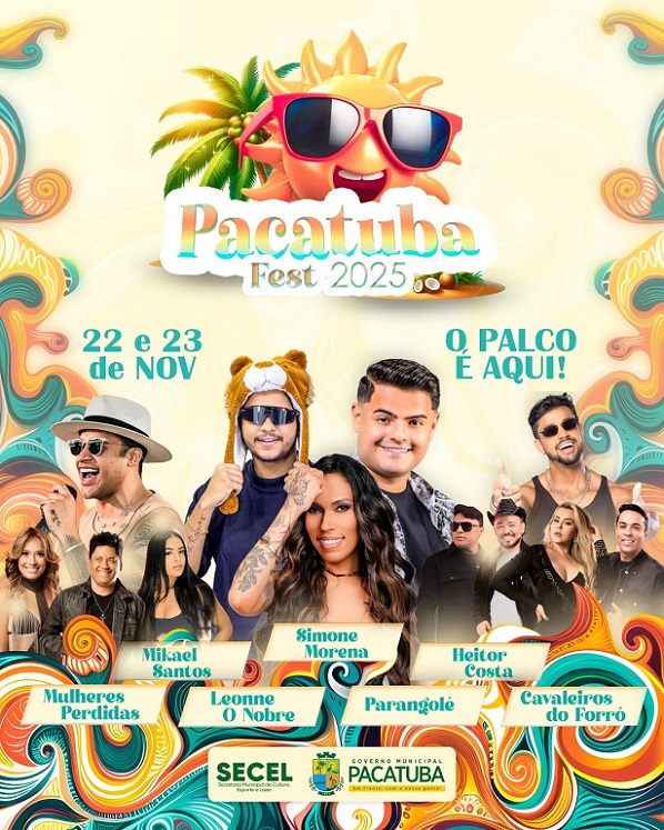 O Governo Municipal de Pacatuba, por meio da Secretaria de Cultura e Turismo, anunciou na quinta-feira, 23/10, as atrações do Pacatuba Fest 2025, um dos maiores eventos culturais do município. A festa promete reunir a alegria do povo pacatubense e visitantes de toda a região, com uma programação musical diversificada que acontecerá nos dias 22 e 23 de novembro.